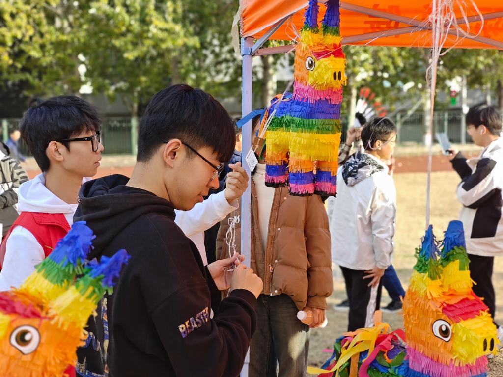 美洲文化体验区由国际学院群英截拳社和国际学院青年志愿者协会共同承办。美洲拥有着丰富的历史文明,通过“美洲文明猜猜猜”、“谁是大力士之掰手腕大赛”以及“挑战双节棍砸墨西哥皮纳塔”等游戏,让师生进一步了解世界文明的多样性,以更加包容互鉴的心态学习各国历史文明。