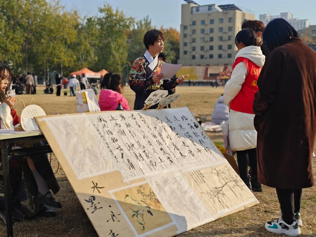 图1.身穿民族服饰的同学为师生介绍中国书法艺术的魅力
