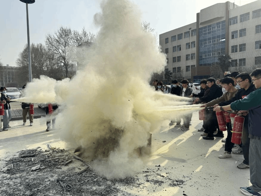 会后,学院在图书馆前组织灭火演练。在教员指导下,师生依次按照规范动作进行了灭火器的实际操作演练,大家牢记“提、拔、握、压”的动作要领,站在上风方向,对火焰根部进行灭火作业。