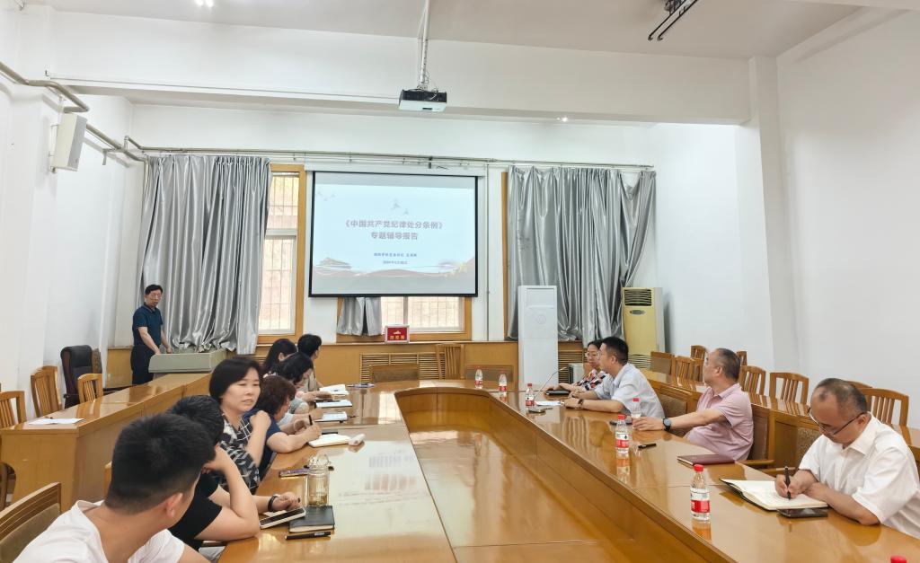 为深入学习贯彻习近平总书记关于加强党的纪律建设重要论述以及关于党纪学习教育重要讲话和重要指示精神,推进党纪学习教育走深走实。5月30日,国际学院党委书记吴国新以《< 中国共产党纪律处分条例>专题辅导报告》为题,为全体教职工党员讲了一堂专题党课。院党委副书记、纪委书记赵强主持党课。