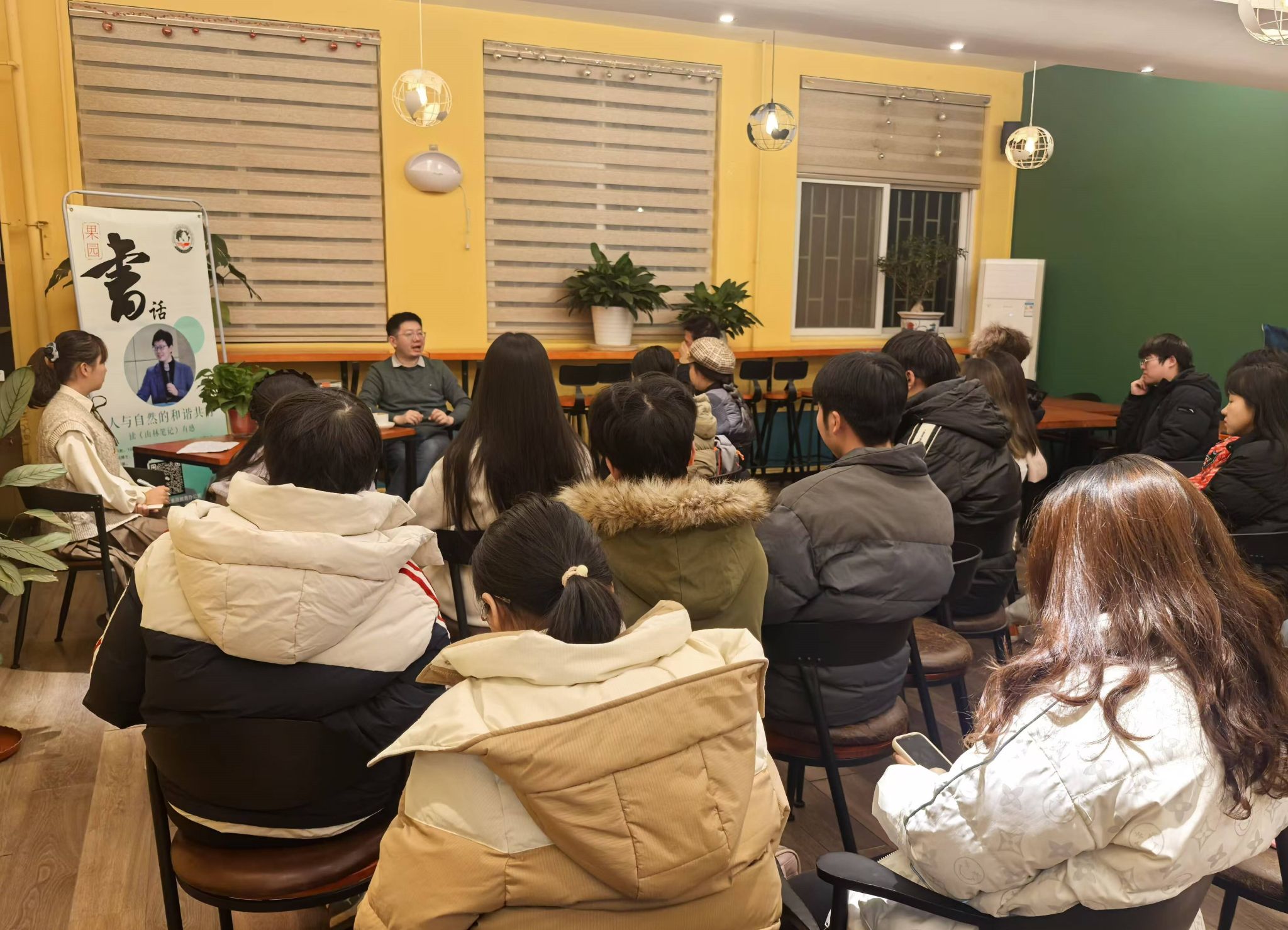 本次读书分享活动以“人与自然和谐共存”为主题,分享了作家胡冬临的《山林笔记》。张老师从书中细腻的自然描写、优美的文词段落及作者对自然生态的深刻感悟等多个维度展开解读,引导并鼓励学生亲近自然、用心感受自然之美,用灵魂感受生命之美,体会自然对人心灵的慰藉和滋养。在互动交流环节,在场学生以生态文学为基础,就如何在现代工业文明的生活中与自然共存,如何平衡专业和爱好等问题与张老师展开热烈探讨。