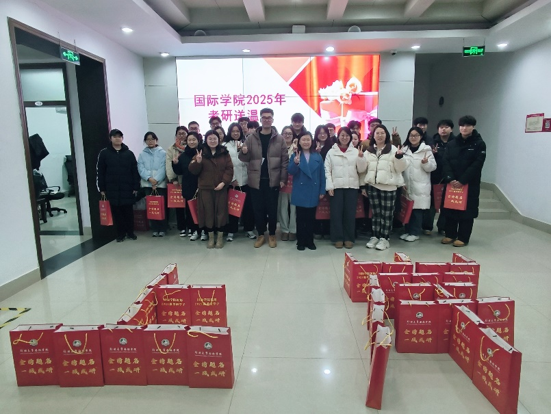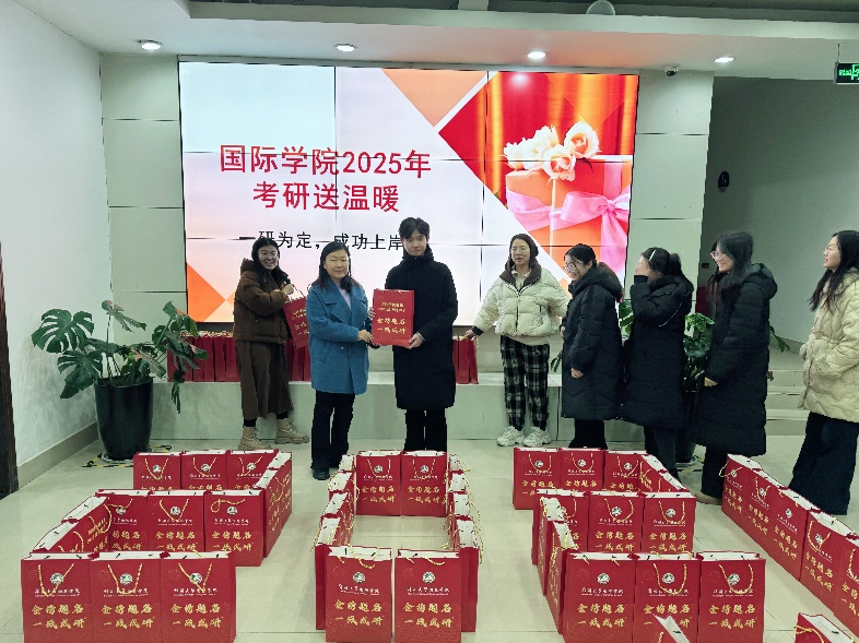 12月18日,国际学院党委副书记庄琼琼、学生工作高级主管孟瑶和2021级全体辅导员在北校区为我院紧张备战研考的学子分发考研爱心加油礼包,爱心加油礼包的礼品袋由学院精心定制,袋身印有“金榜题名,一战成研”字样,传递着学院对于考研学子的祝福和期望。礼包内装有学院特别购置搭配的食品,每样礼品都富含着特别的意义,寄托着老师们对学子们的支持和鼓励。希望全体学子能够全力以赴,披荆斩棘,一举夺魁!