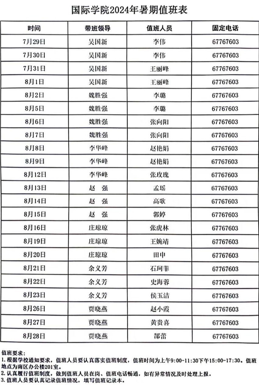 国际学院2024年暑期值班表