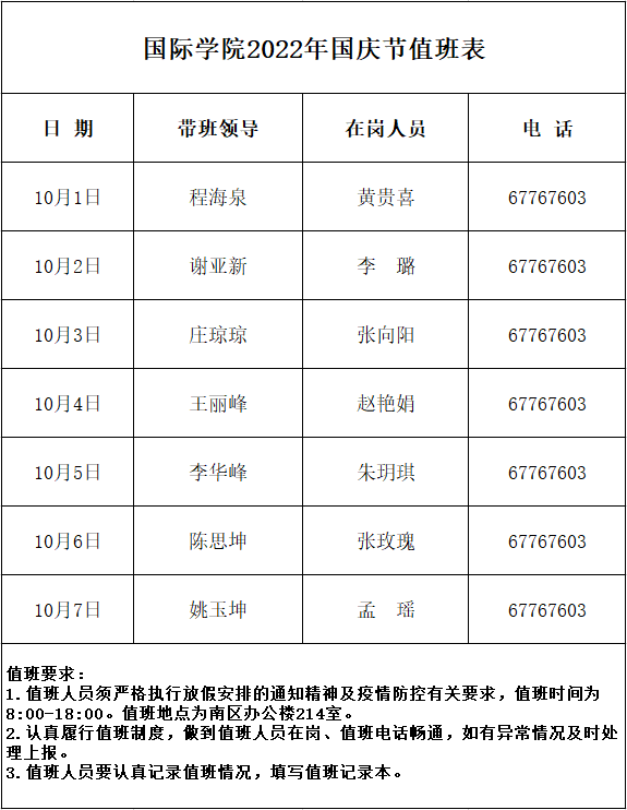 国际学院2022年国庆节值班表