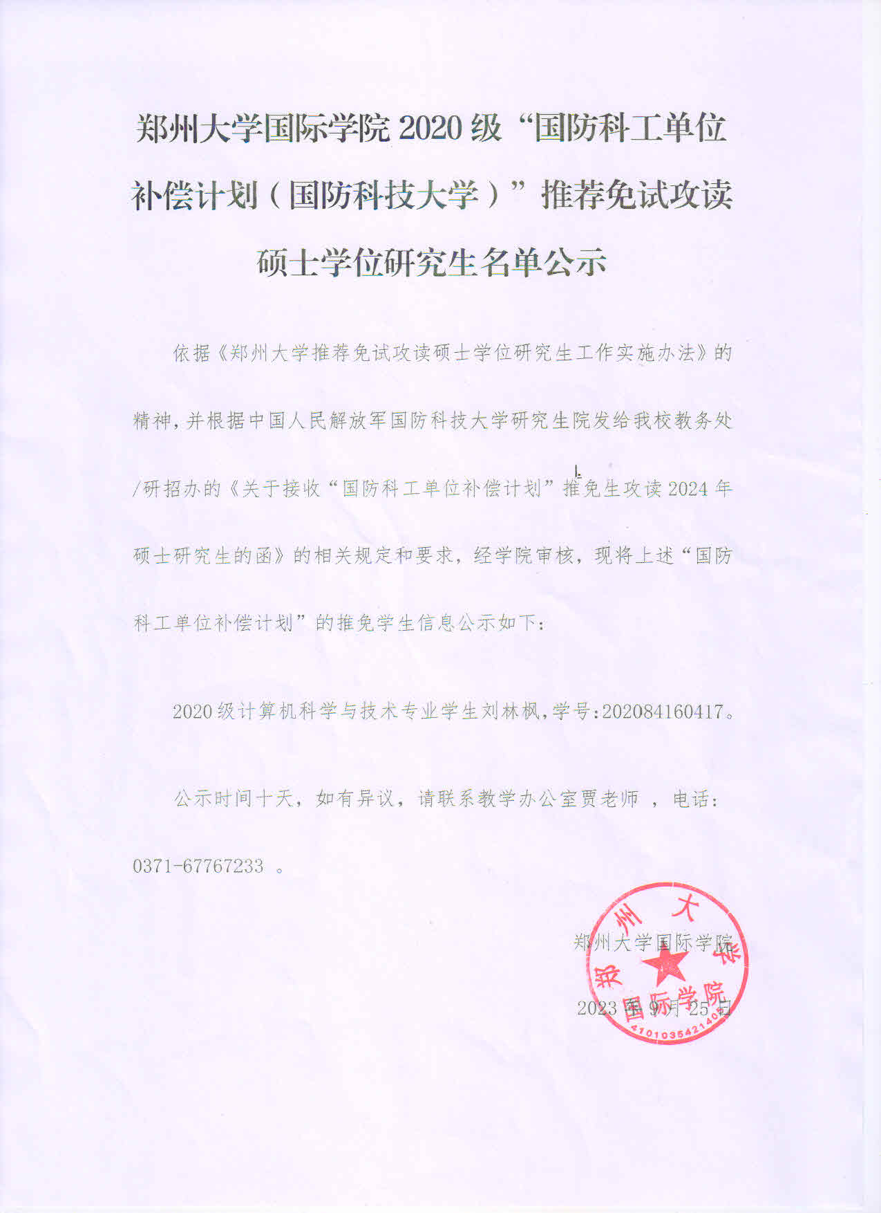 郑州大学国际学院2020级“国防科工单位补偿计划(国防科技大学)”推荐免试攻读硕士学位研究生名单公示