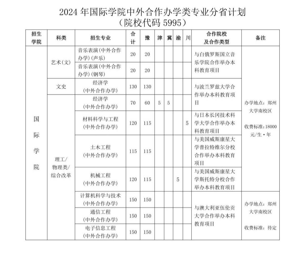 2024年国际学院中外合作办学类专业分省计划(院校代码5995)
