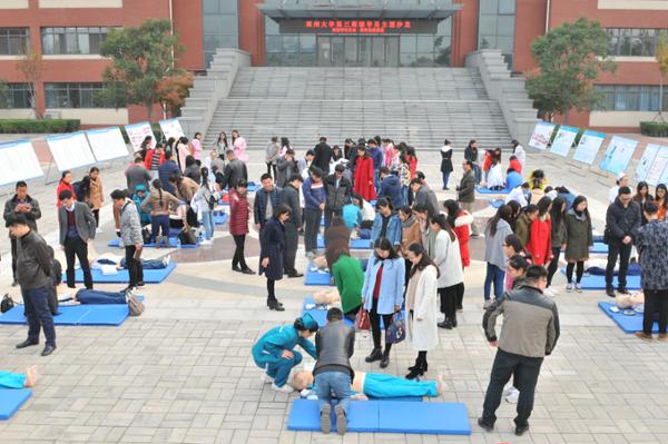 在知识讲座中,我院张凡老师用简洁通俗的语言和图文并茂的PPT向在场辅导员传授了徒手心肺复苏技能的理论和操作流程,并围绕C-A-B(胸外按压,打开呼吸道,人工通气)的方法和动作要领进行了全面而详细的解读。张老师强调,心肺复苏是与时间的赛跑,在危机情况下能够为患者实施有效的抢救措施,对挽救患者的生命具有十分重要的价值。接着,张老师用人体模型将心肺复苏的完整流程进行了示范,帮助辅导员们建立了更加直观的认识。随后,活动进入到实地演练环节,在该环节中我院组织各位辅导员老师在南丁格尔广场上使用21具模拟人进行心肺复苏的演练,并选派出了13名专业老师为他们进行现场实战演练操作,来帮助他们更好的掌握各环节的要领与技巧。辅导员老师们个个积极参与,认真学习,刻苦演练,在实践中体会并掌握了徒手心肺复苏技能,达到了此次培训的预定目标,使活动取得圆满成功。