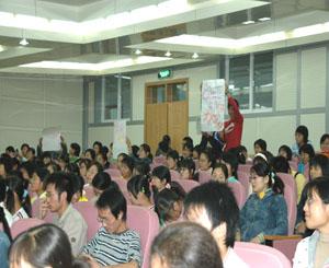 下午5时比赛在主持人的开幕辞中正式开始,首先是1号选手王杉,措辞有力,表达清晰;比赛在5号刘茹的一声:”I like swimming,but I can’t.”的回答中进入高潮;8号许媛媛更像是稚气未脱的的小学生,但也不示弱。最可爱奖非此二位莫属;再看3号布宇彤,酷酷的“帅气”加上流利的表达,深得大家的喜欢;最佳发音奖当属11号祝文静和12号王晶,她们的发音正体现了美语的音乐性;10号戚志娟和14号范晓冰当属最佳形象奖;其他选手也各显身手,比赛场面好不激烈。选手的亲友团们也为鼓励自己支持的对象纷纷打出支持的海报、条幅,增加了现场的气氛。评委老师们从专业的角度适时对选手的演讲进行点评,指出选手的优缺点,及时提出相应提高英语水平的方法及建议,令每位选手都受益匪浅。