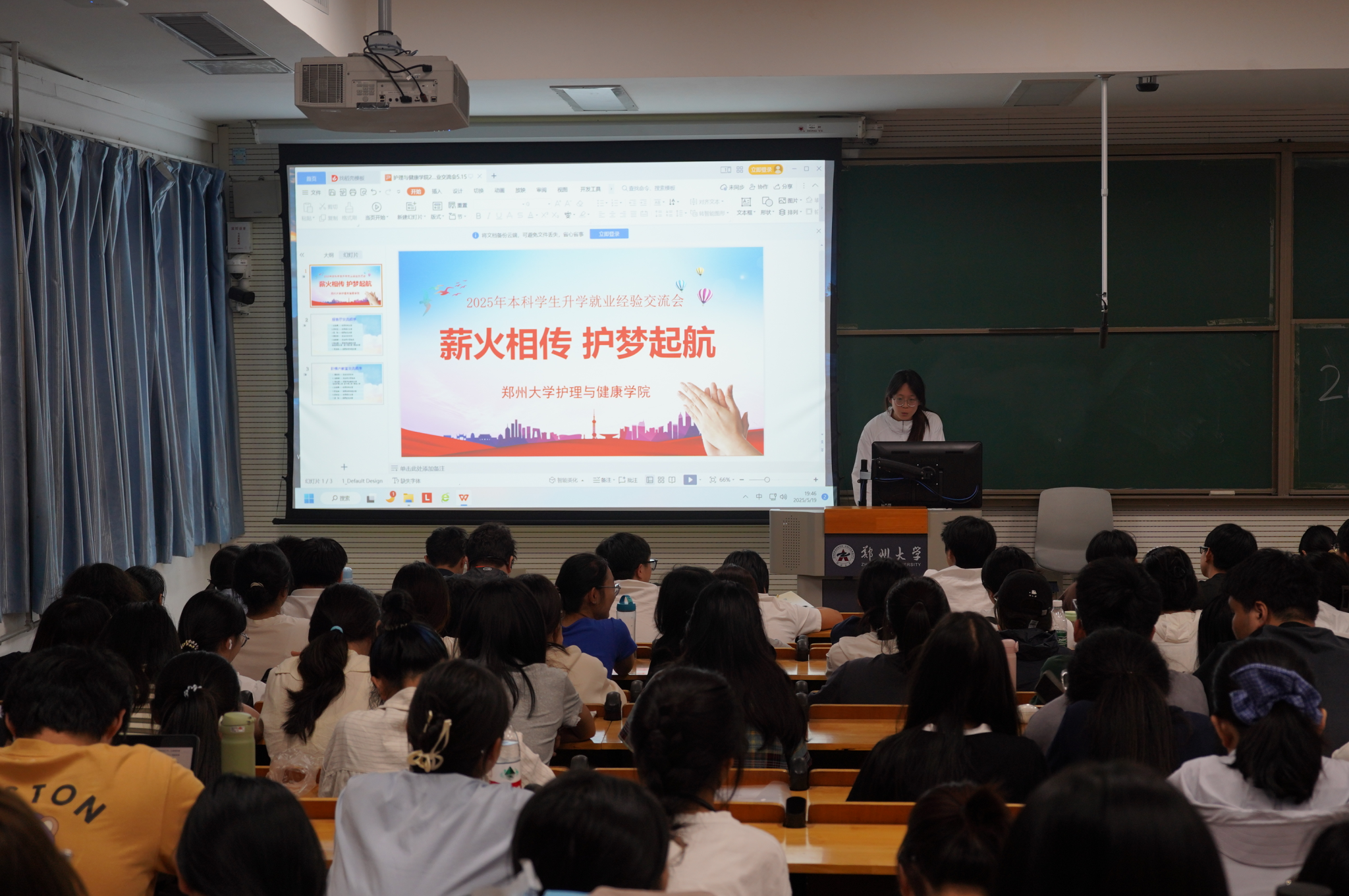5月19日,郑州大学护理与健康学院举办“升学就业经验交流会”, 活动通过线下两个会场同步进行,七位2025届优秀毕业生结合自身经历,为五百多名低年级学生提供了涵盖保研、考研、就业及留学的全链条指导。