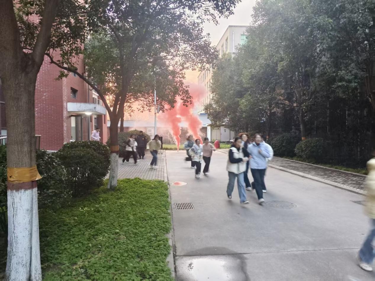 讲座结束后,宿舍火灾逃生演习正式拉开帷幕。模拟火情设定为某学生宿舍因违规使用电器引发“火灾”,烟雾弥漫。随着学生代表发布疏散指令。在安保和宿管人员的引导下,同学们迅速弯腰低姿,沿着安全通道有序撤离。整个过程紧张有序,所有参演学生在规定时间内安全抵达指定集合点。