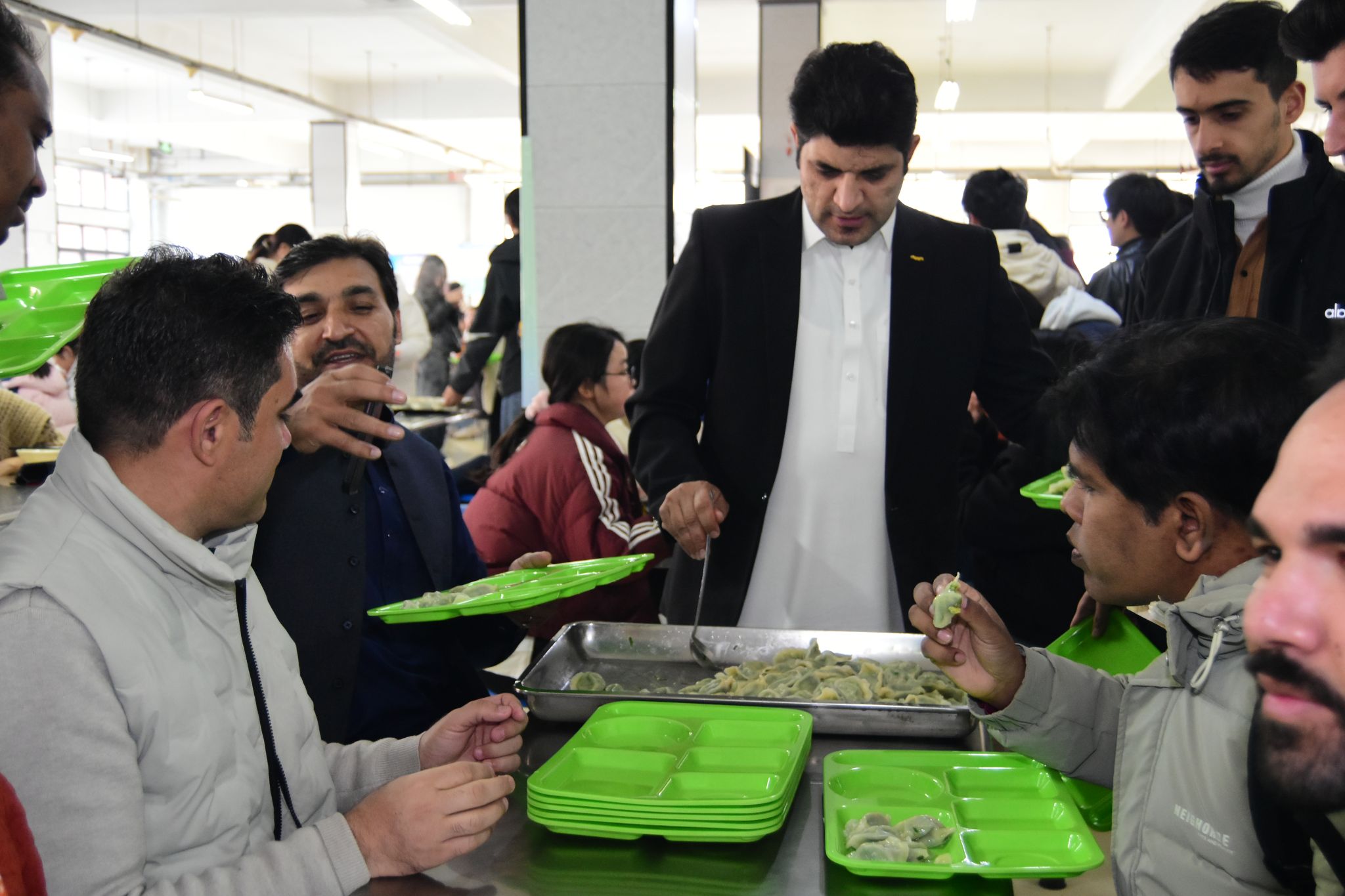 全院师生们主动分工、默契协作,大家手上动作娴熟,脸上笑意盈盈,现场氛围温馨而热烈。经过大家共同忙碌,一盘盘造型饱满、鲜香四溢的饺子陆续出锅,热气腾腾地端上餐桌。一碗碗饺子,不仅驱散了冬日的寒意,更让奋战在教学、科研一线的教职工缓解了工作疲惫,让全体学子深切感受到学院“大家庭”的温暖关怀;也让远道而来的国际留学生沉浸式体验了中国“冬至吃饺子”的民俗传统,在参与中领略中华优秀传统文化的独特魅力,搭建起跨文化交流的温馨桥梁。