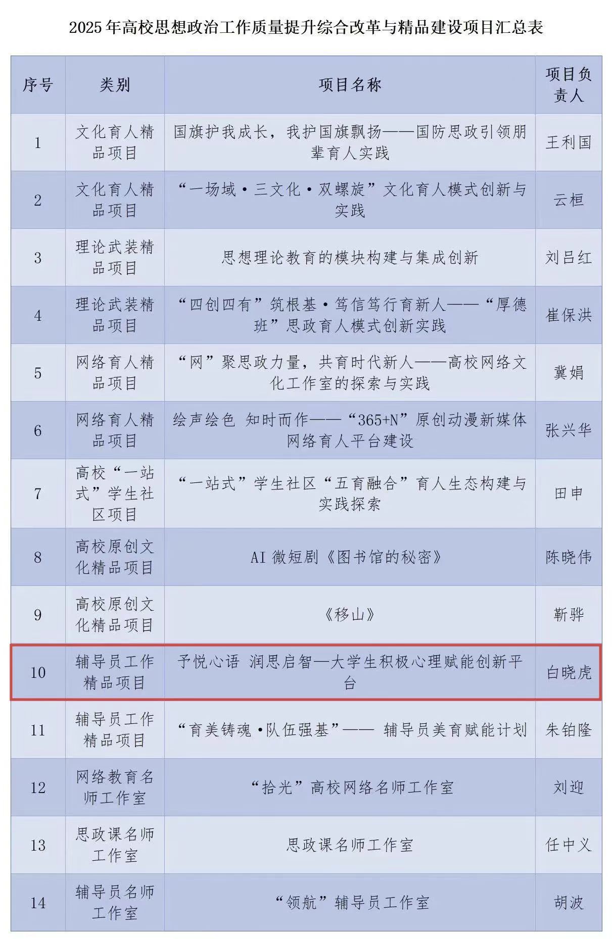 近日,中共河南省委教育工委、河南省教育厅办公室公布2025年河南省高校思想政治工作质量提升综合改革与精品建设项目入选名单,全省178所高校共有180个项目入选,其中郑州大学有14个项目入选,由化工学院白晓虎老师主持的“予悦心语 润思启智——大学生积极心理赋能创新平台”项目入选辅导员工作精品项目。