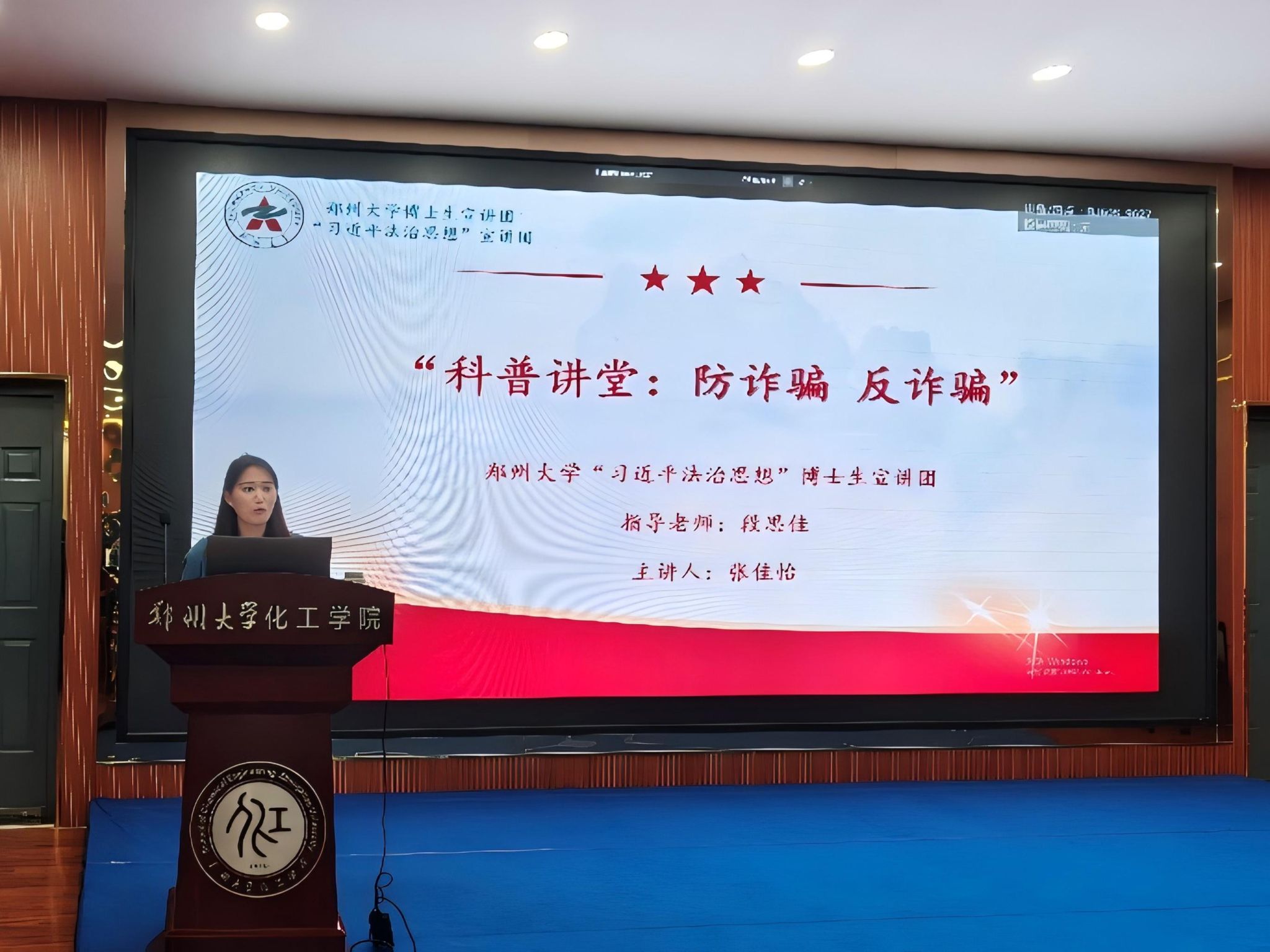 为切实提升广大研究生识诈、防诈、反诈的意识和能力,筑牢校园安全防线,4月3日,化工学院邀请郑州大学博士生宣讲团在学院四楼报告厅举办“防诈骗·反诈骗”主题科普讲堂。本次活动由宣讲团成员张佳怡主讲,学院研究生辅导员赵笑统、武莹及各年级研究生代表参会。