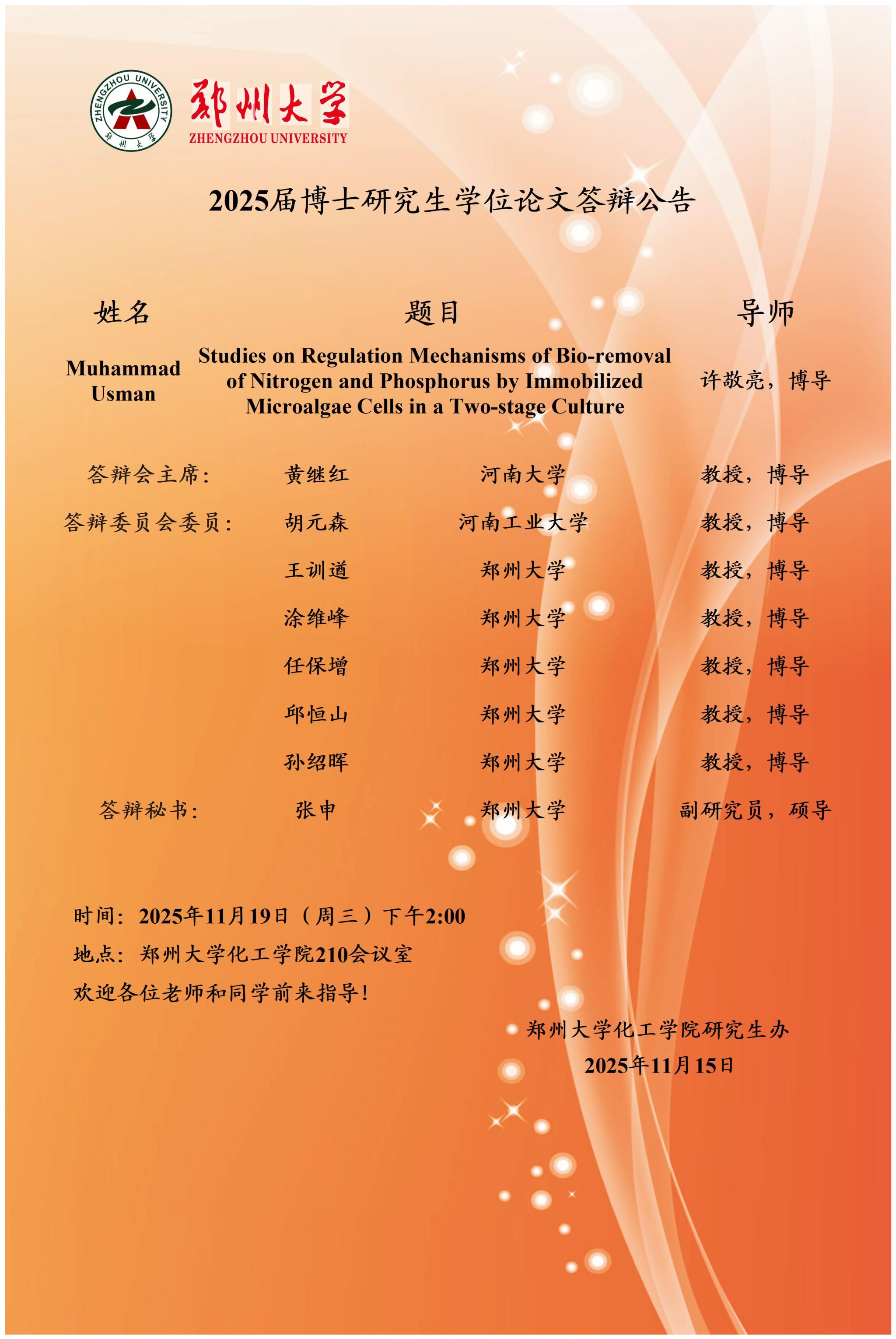 Muhammad Usman博士学位论文答辩公告