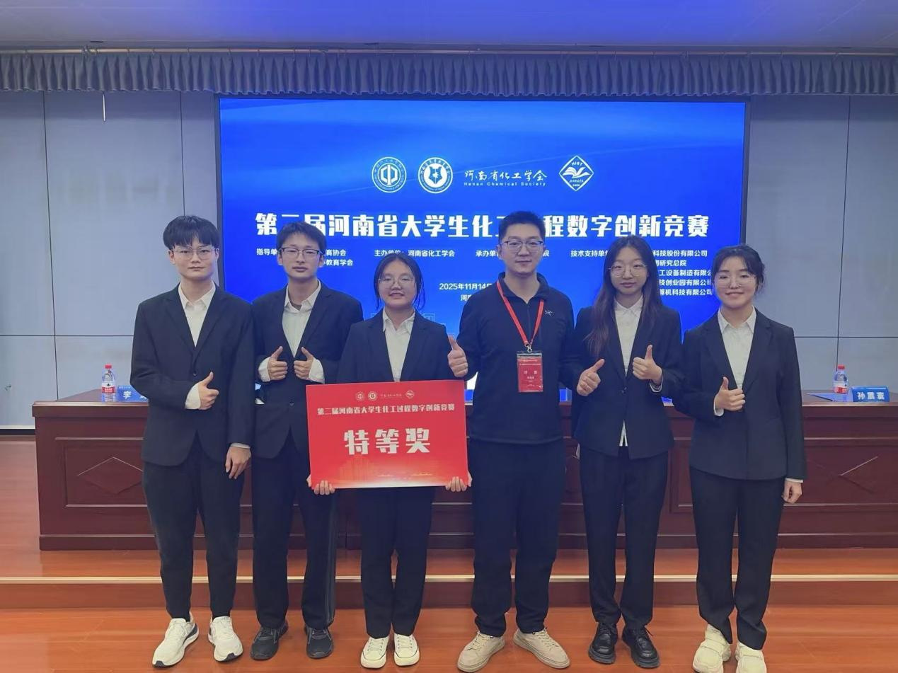 近日,第二届河南省大学生化工过程数字创新竞赛在河南新乡举行。由郑州大学化工学院2023级本科生查晨曦、张洁、李锦泼、曹容榕、付朝阳五位同学组成的“星火馏原”团队以优异成绩成功进入决赛。经过决赛和总决赛两轮激烈比拼,最终获得第二届河南省大学生化工过程数字创新竞赛特等奖,团队指导教师徐丽、李东洋、王景获得优秀指导教师奖。