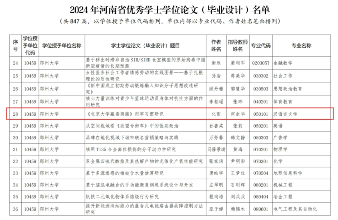 古文字学特专班毕业生获2024年河南省优秀学士学位论文