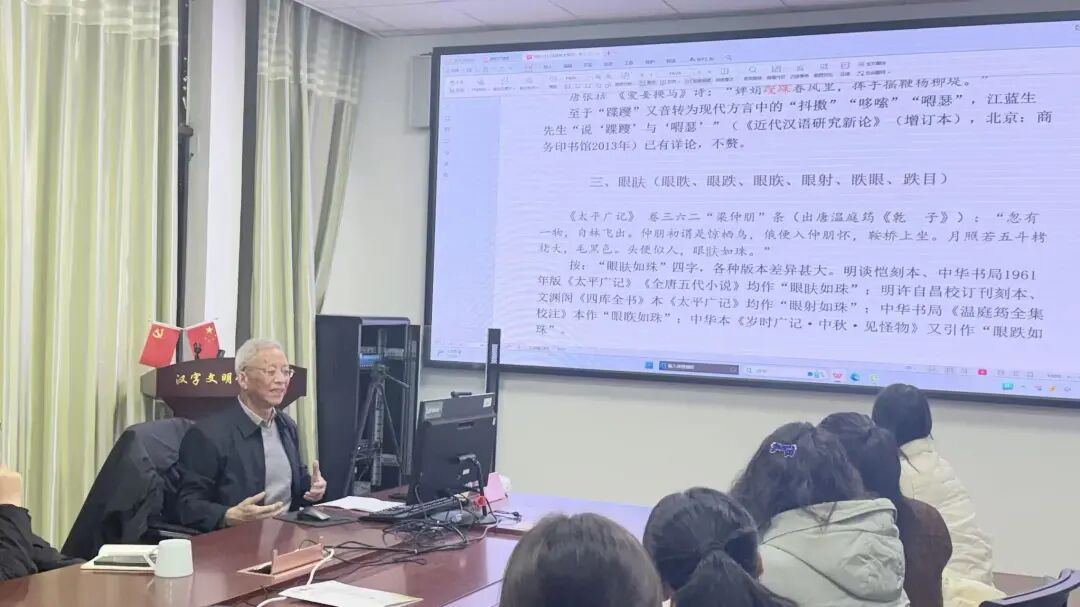 2025年11月24日上午,南京师范大学文学院教授、北京语言大学文献语言学研究所特聘教授董志翘老师,应邀为郑州大学汉字文明中心、郑州大学文学院师生作了题为《关于几个中古汉语词语的用字问题》的学术讲座。本次讲座由中心执行主任何余华主持,中心老师苗利娟、张阳、李晶、武亚帅、王晓玉等,以及古文字特专班本科生、相关专业硕博研究生等共同聆听了此次报告。