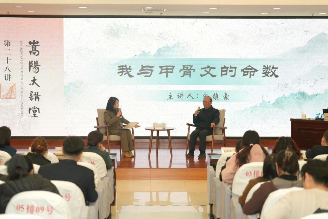 11月20日,由文学院协办的郑州大学“嵩阳大讲堂”第二十八讲宋镇豪学部委员报告会于主校区综合管理中心第二报告厅举行,文学院师生参与讲座,共同感受宋镇豪与甲骨文的命数。