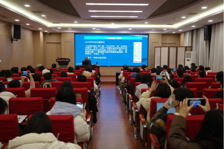2025年12月12日,复旦大学文科资深教授、出土文献与古文字研究中心主任刘钊教授,应邀为郑州大学汉字文明研究中心和文学院师生作了题为《“昆仑石刻”的发现与认识》的学术报告。本次报告由汉字文明研究中心主任李运富教授主持,文学院副院长齐航福教授、牛振副教授,中心执行主任何余华副教授以及中心全体教师与硕博研究生,共同聆听了此次报告。