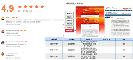 课程每年网上教评成绩优秀,创意课堂和案例教学活动在郑州大学网上新闻进行报道,受到广大师生的好评。同行专家认为《医学遗传学》与《医学细胞生物学》线上一流课程定位准确,教学内容质量高,课程知识体系科学完整。校内督导专家认为该课程教学模式多样,线上线下结合效果好,有效提高了教学质量,在同类课程中具有较好的导向性和示范性。