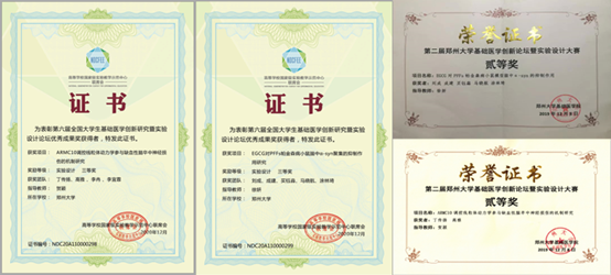 贾利云、贺颖、徐妍、贾竟指导的学生分别在郑州大学及全国大学生基础医学创新论坛暨创新实验设计大赛中获得银奖、铜奖或优秀奖。陈辉副教授主持的“案例教学在医学遗传学教学效果的应用研究”2020年获河南省卫健委医学教育优秀教学成果三等奖,郑红教授主持的“基础医学虚拟仿真实验教学中心建设”获教育厅教学成果二等奖。