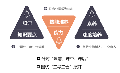 课程以“立德树人、三全育人”为根本,“两性一度“ 为标准,针对“课前、课中、课后”的三个核心环节,围绕“三导三和”展开。三导是指问题、案例、情景导入为一体,体现课程的创新性;三合是指基础与临床的整合;前驱和后续课程的融合;思维、表达、协作能力的综合,体现课程的高阶性,并将思政元素和医学职业素养教育贯穿人才培养的全过程,打造有思想、有内容、有温度的金课。