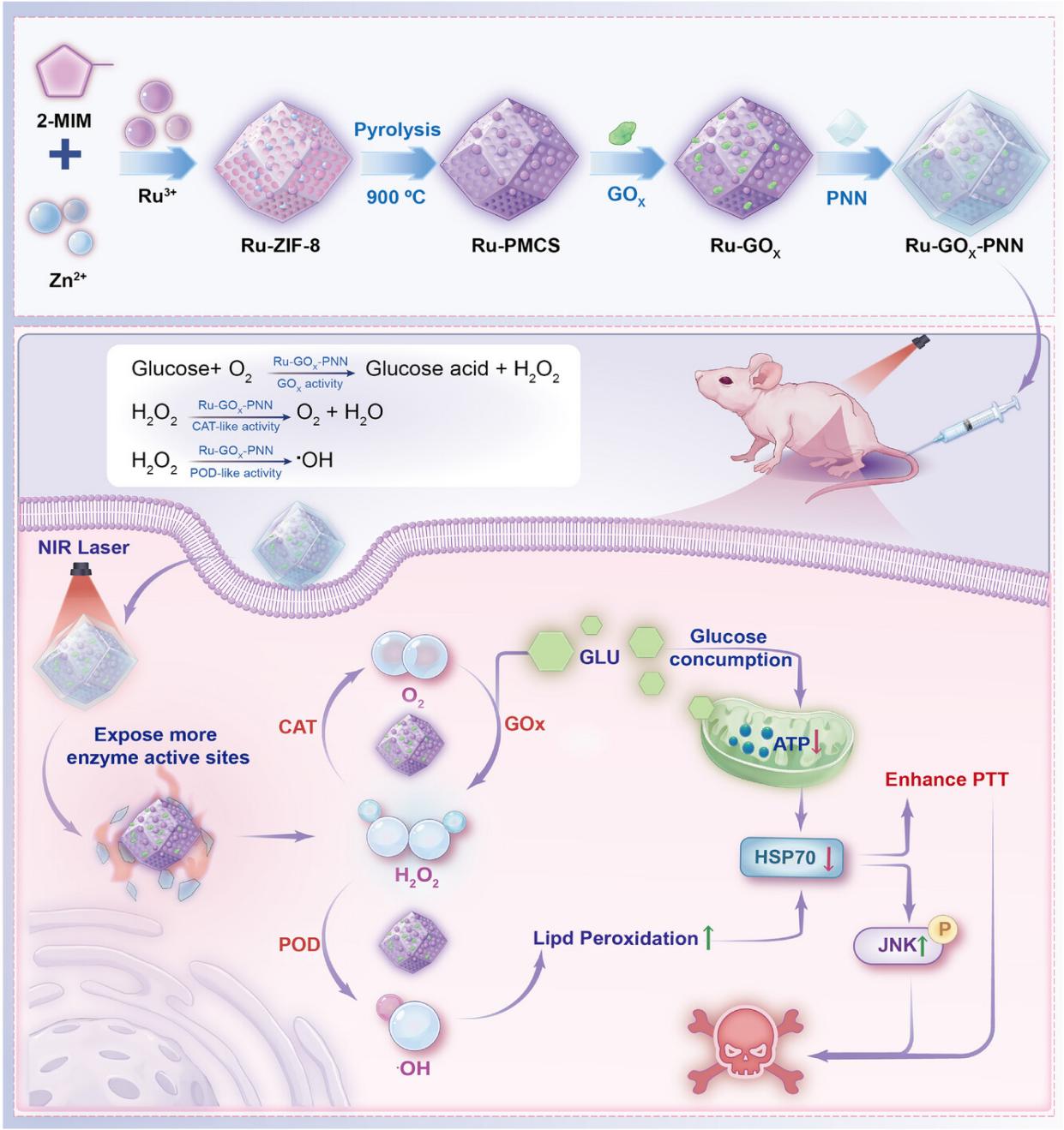 图1. 温控响应型Ru-GOx-PNN纳米酶系统用于增强温和光热治疗(mPTT)的示意图。在近红外(NIR)照射触发的低温光热条件下,表面包覆的温敏水凝胶(PNN)发生相变,暴露出更多酶的催化位点,从而激活级联催化反应。其中,GOx-POD级联产生•OH,诱导脂质过氧化并促进HSP70降解;GOx-CAT级联通过消耗葡萄糖抑制ATP合成,进一步下调HSP70表达。通过对HSP70的双通路抑制,有效缓解了细胞的热耐受性,并激活JNK信号通路,最终促进肿瘤细胞凋亡,显著提升温和光热治疗的疗效。