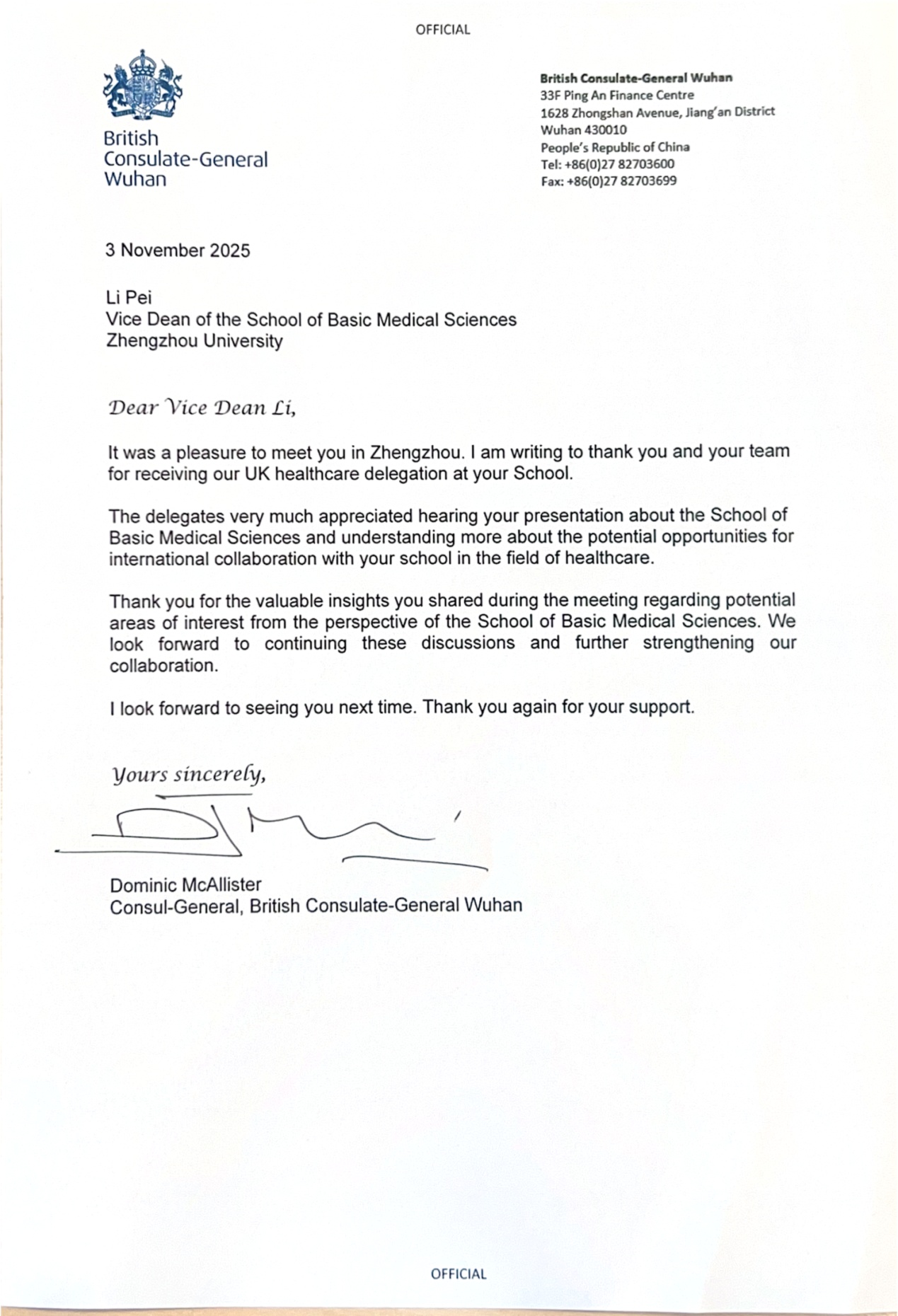 11月3日,我院副院长李沛教授收到了英国驻武汉总领事馆总领事Dominic McAllister-麦多明秘书发来的一封领事手签感谢信。该邮件中,Dominic McAllister-麦多明总领事感谢了郑州大学基础医学院在英国医疗代表团参观访问基础医学院过程中的热情接待,并期待与我院在卫生健康领域的交流继续推进相关讨论并进一步深化合作关系。