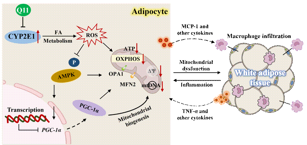 CYP2E1抑制剂Q11对高脂饮食肥胖小鼠减重作用机制示意图