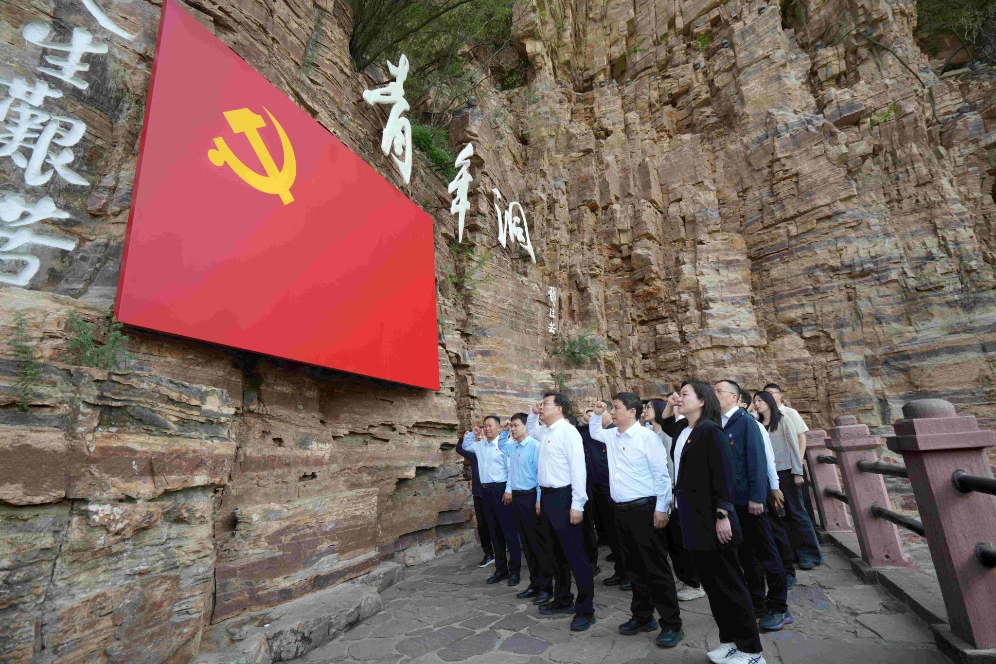 随后,大家前往红旗渠核心工程青年洞,参观绝壁凿渠的震撼实景,近距离感受建设者不畏艰险、顽强拼搏、无私奉献的精神力量。全体党员面向党旗庄严列队、高举右拳,重温入党誓词,更加坚定为党育人、为国育才的使命担当。