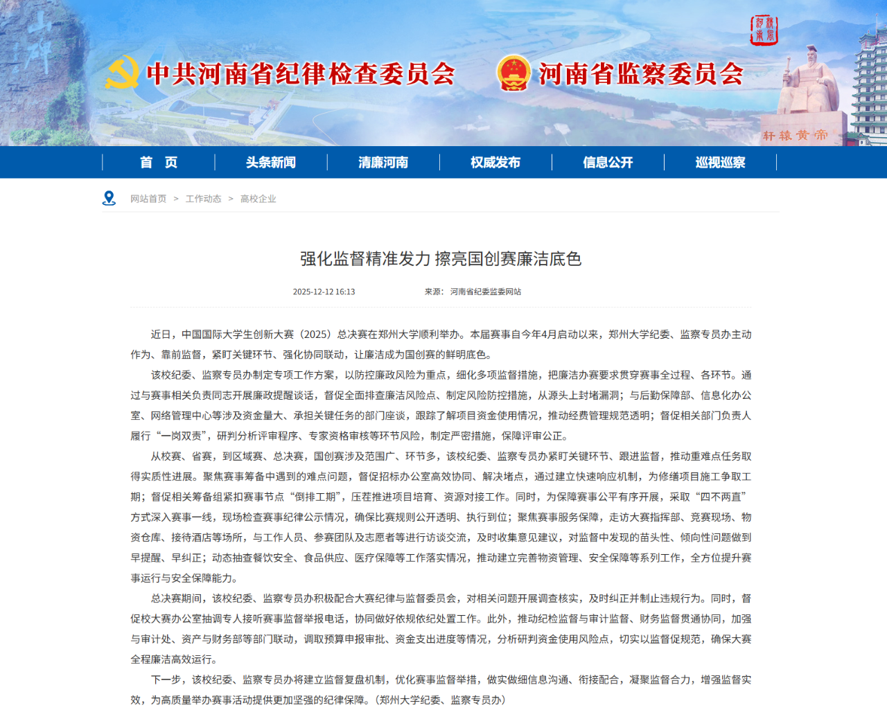 12月12日,河南省纪委监委网站报道我校纪委、监察专员办为中国国际大学生创新大赛(2025)总决赛顺利举办提供监督保障工作。原文如下: