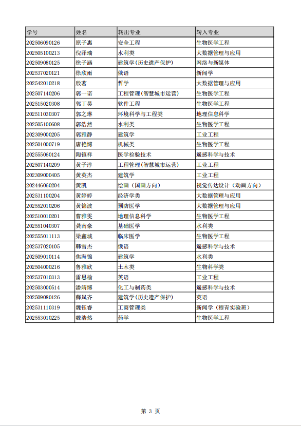 根据《关于做好2025-2026学年第2学期转专业工作的通知》,经学院考核通过,以下学生获得转专业资格,现公示如下,公示截止期至2026年3月20日18时。如有异议,请于公示截止期前以书面实名形式反映至教务部学籍管理科,地点:综合管理中心235室,联系电话:67739185。