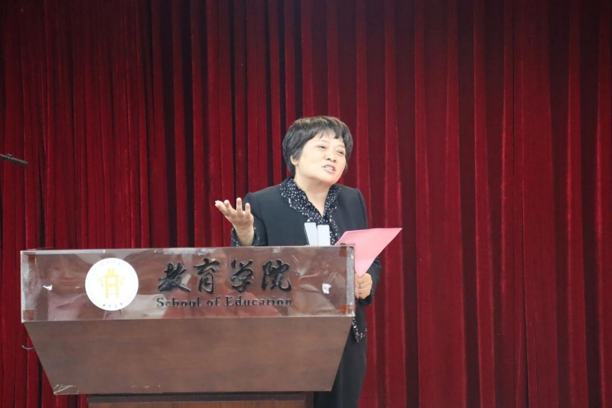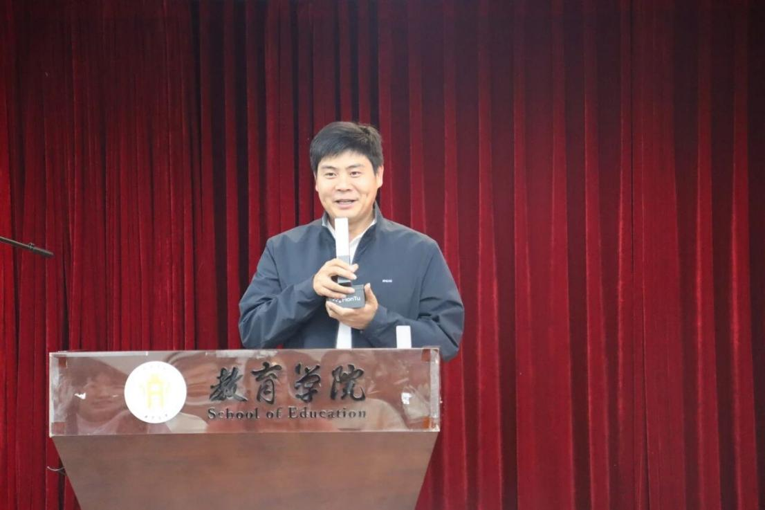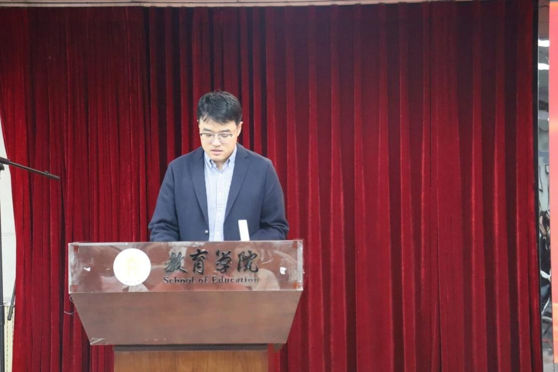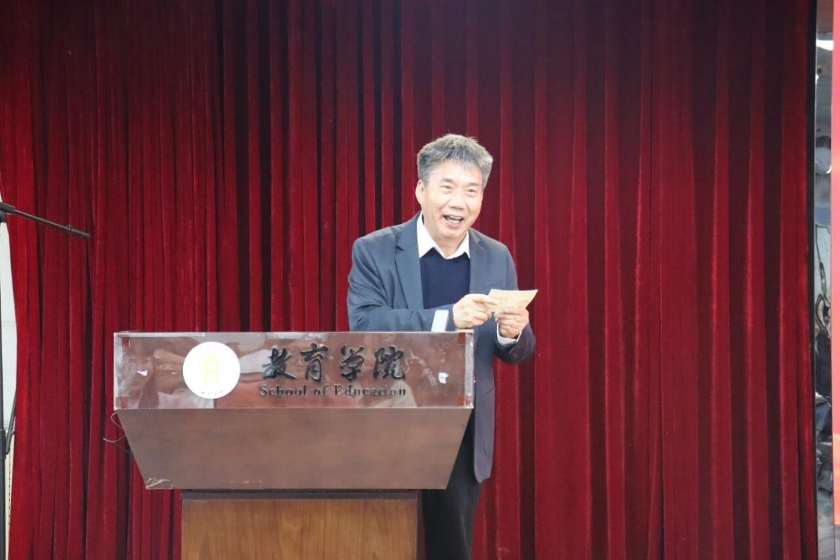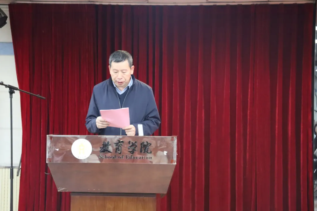 教师代表杨光钦教授向新生们表达了诚挚祝贺。他围绕“传承、学习、担当”三个关键词,对同学们提出殷切期望。他指出,作为教育学院的学子,大家肩负着传承知识、启迪心灵的特殊使命。他鼓励同学们尽快完成角色转变,主动学习、广泛阅读、勤于思考,夯实专业基础;同时心怀家国,将个人成长融入国家教育事业发展,努力成长为卓越的教育工作者。杨教授的发言恳切有力,赢得了全场热烈掌声。