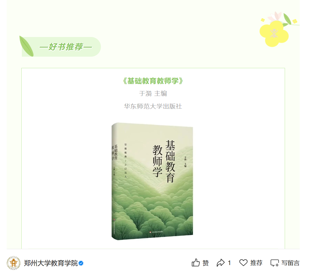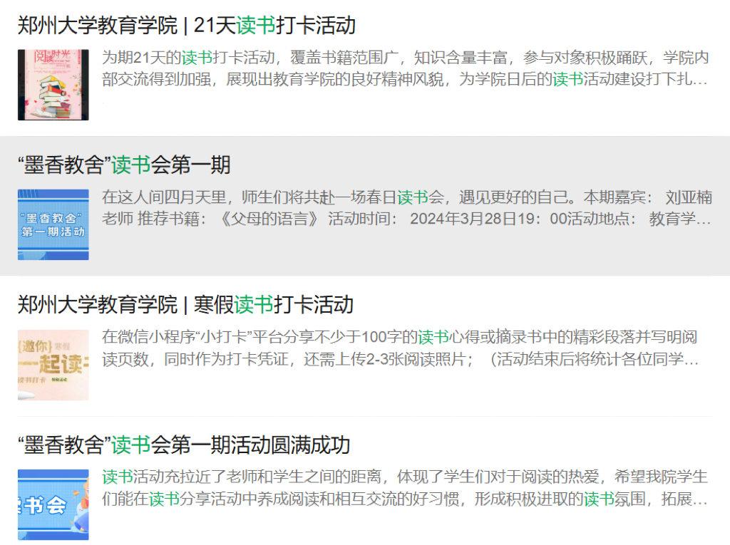 最是书香能致远,腹有诗书气自华。为深入落实习近平总书记关于“爱读书、读好书、善读书”的重要指示精神,积极响应“深化全民阅读活动”的国家号召,切实落实立德树人根本任务,厚植校园阅读文化底蕴,郑州大学教育学院立足育人特色,聚焦学生专业成长与精神涵养,多措并举,搭建多元阅读平台、优化阅读环境、丰富阅读载体,全力打造书香浸润、全员参与的沉浸式阅读育人新生态。