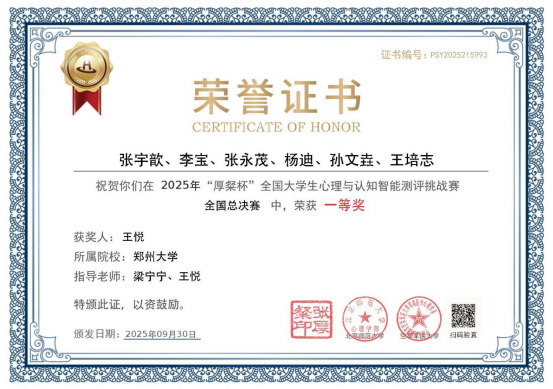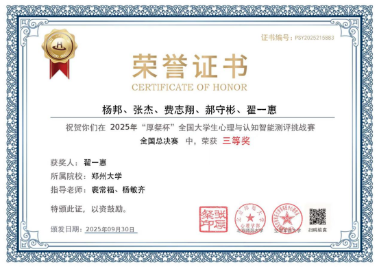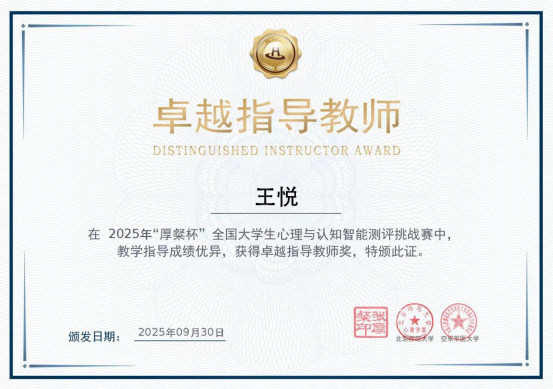 此次“厚粲杯”全国大学生心理与认知智能测评挑战赛中取得的优异成绩,不仅是对我院师生专业能力与奋斗精神的肯定,更是学院近年来深耕“理论+实践”双轨育人模式的生动成果。未来,我院将以此次赛事为新起点,持续完善“赛事引领、实践赋能”的培养体系,搭建更多高水平交流展示平台,鼓励师生在专业领域不断探索、勇于突破,为培养更多“懂理论、会实践、善创新”的高素质人才注入新动能。