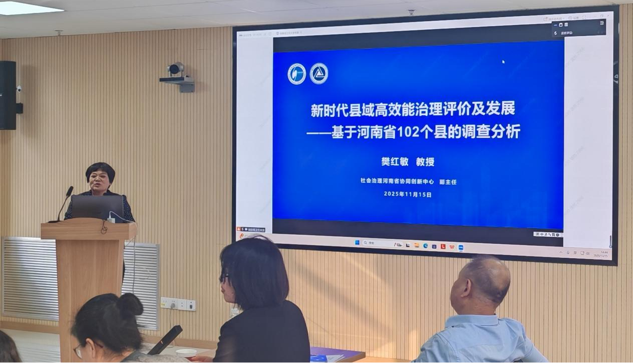 2025年11月15日,第四届稷下国家治理高端论坛在山东大学中心校区成功举办。论坛由山东大学主办,山东大学国家治理研究院、山东大学智库建设中心联合承办,以“面向‘十五五’的国家治理现代化新议程”为主题。教育部社会科学司副司长陈郭华,中共山东省委宣传部副部长、一级巡视员魏长民,山东大学原校长、国家治理研究院院长樊丽明出席开幕式并致辞,山东大学副校长、国家治理研究院常务副院长曹现强主持开幕式。本次论坛汇聚了来自全国40余所高校、8家核心期刊及实务部门的150余位专家学者,共话国家治理现代化的新路径与新使命。郑州大学教育学院院长、社会治理河南省协同创新中心副主任、政治与公共管理学院教授樊红敏受邀参会,在“‘十五五’社会治理新议程”子论坛中,以“县域高效能治理评价与发展”为题作专题报告。