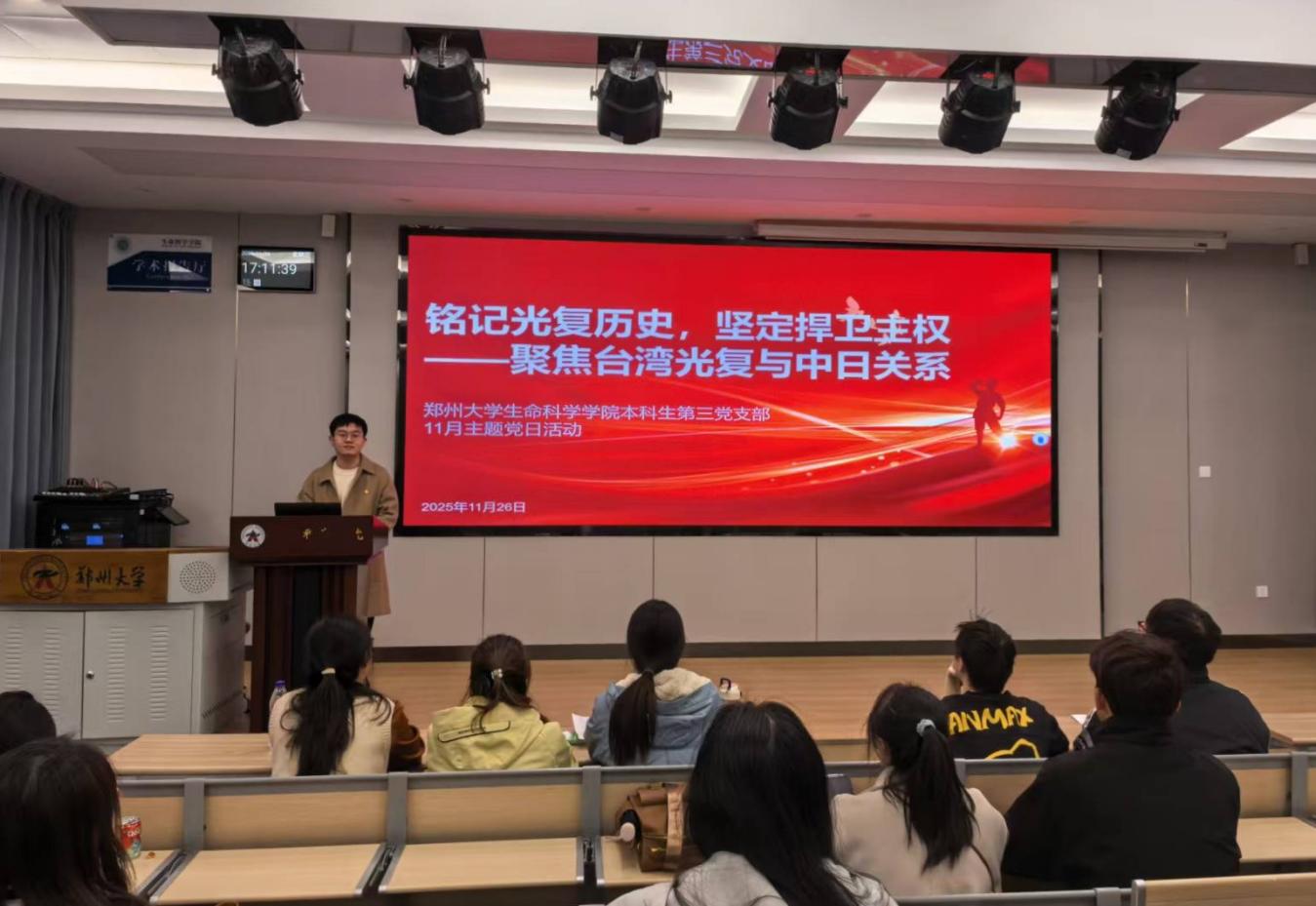 为办好首个台湾光复纪念日的庆祝活动,同时引导学生党员密切关注国内国际形势,11月26日,郑州大学生命科学学院本科生第三党支部在学院301教室开展“铭记光复历史,坚定捍卫主权——聚焦台湾光复与中日关系”主题党日活动。活动由支部副书记于果同志主持。