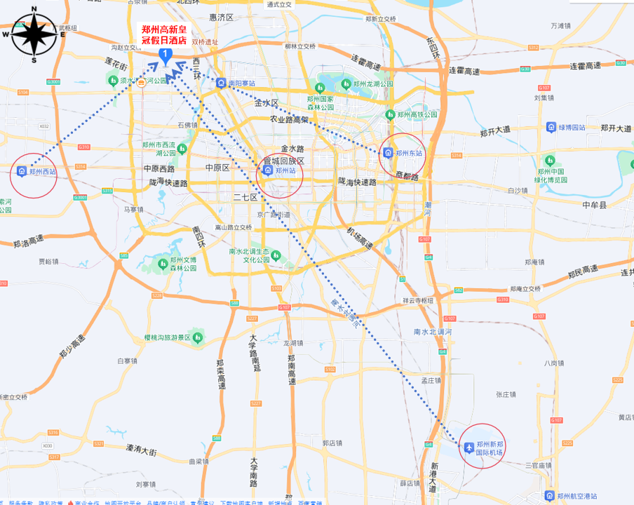 机场:新郑国际机场→郑州高新皇冠假日酒店,路程52 km,出租车,费用70-100元,车程约50分钟。