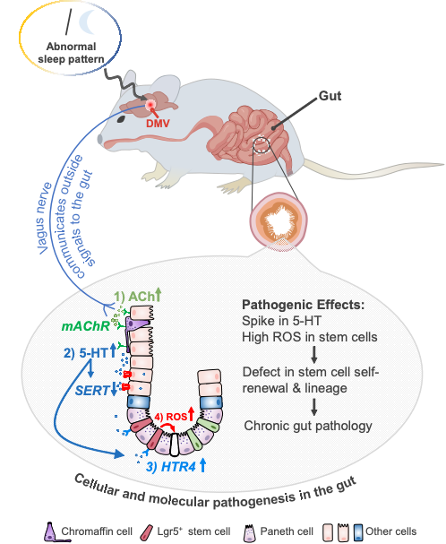 研究发现,位于延髓的DMV是大脑中对睡眠剥夺高度敏感的关键神经核团。睡眠不足可异常激活 DMV 神经元,增强迷走神经向肠道释放乙酰胆碱;乙酰胆碱进一步作用于肠上皮细胞的毒蕈碱型受体,促使肠嗜铬细胞大量释放五羟色胺(5-HT),并抑制其再摄取,导致肠道局部 5-HT 急剧升高;过量的5-HT激活肠道干细胞表面的 HTR4 受体,引发显著的氧化应激和整合应激反应,从而损害了肠道干细胞的自我更新和再生能力。动物实验显示,睡眠剥夺仅两天即可使小鼠肠道干细胞数量减少一半。