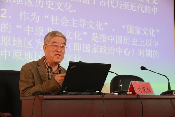 聘任仪式后,刘庆柱先生为历史学院师生作题为《关于中原历史文化的思考》的学术报告。刘庆柱先生对中原历史文化从时间和空间两个方面作以说明,阐释了中原文化为何为国家文化;对“文化地图”进行了解读,指出不同的地理环境造就了不同的政治文化、“日常文化”和精神文化;认为国家文化的特点是其政治属性,其物化载体是都城(宫殿、宗庙、陵墓等)、与“戎”与“祀”相关的遗物、遗迹等;对中原历史文化作以定位,指出中原历史文化是“一脉相承”的,中原历史文化是以本地史前文化为基础,容纳百川而形成的国家文化,“国家”形成后至北宋的中原历史文化,基本属于中国古代历史上的“社会主导文化”。