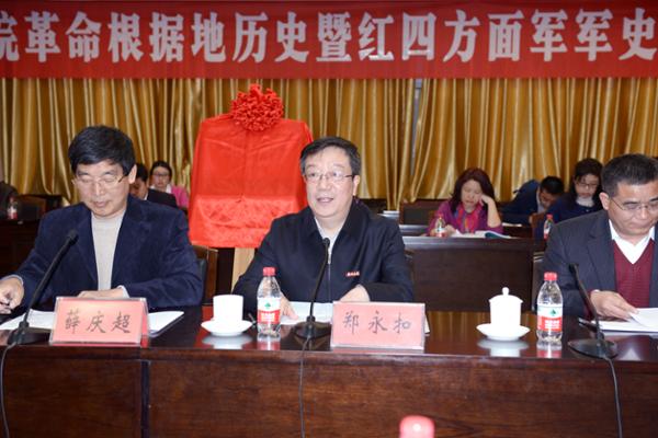 郑永扣书记致欢迎辞。他指出,包括红色文化在内的中原历史文化是我校努力打造的四个优势特色学科之一,此次研讨会的召开必将推进红色文化研究,尤其是鄂豫皖革命根据地历史研究的深入发展。薛庆超局长在讲话中指出,党的十八大以来,习近平总书记高度重视党史工作,郑州大学切实贯彻总书记系列讲话精神,与中央党史研究室合作共建“鄂豫皖革命根据地暨红四方面军研究中心”,旨在进一步深化党史研究,特别是加强鄂豫皖革命根据地历史与红四方面军军史的研究,为全面建成小康社会、全面深化改革、全面推进依法治国、全面从严治党提供强大的精神动力。省委党史研究室张守四处长代表会议主办单位致辞。随后,薛庆超局长与郑永扣书记共同为“鄂豫皖革命根据地暨红四方面军研究中心”揭牌。