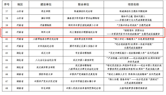 近日,教育部、国家文物局公布以中国人民抗日战争暨世界反法西斯战争胜利80周年为主题的大中小学“大思政课”优质资源建设推介项目名单,我院联合巩义豫西抗日根据地纪念馆申报的“‘纸短情长 家国永念——中原英烈家书中的抗战精神’主题思政实践教学”获批精品项目,该项目也是我省本科高校唯一入选的推介项目。