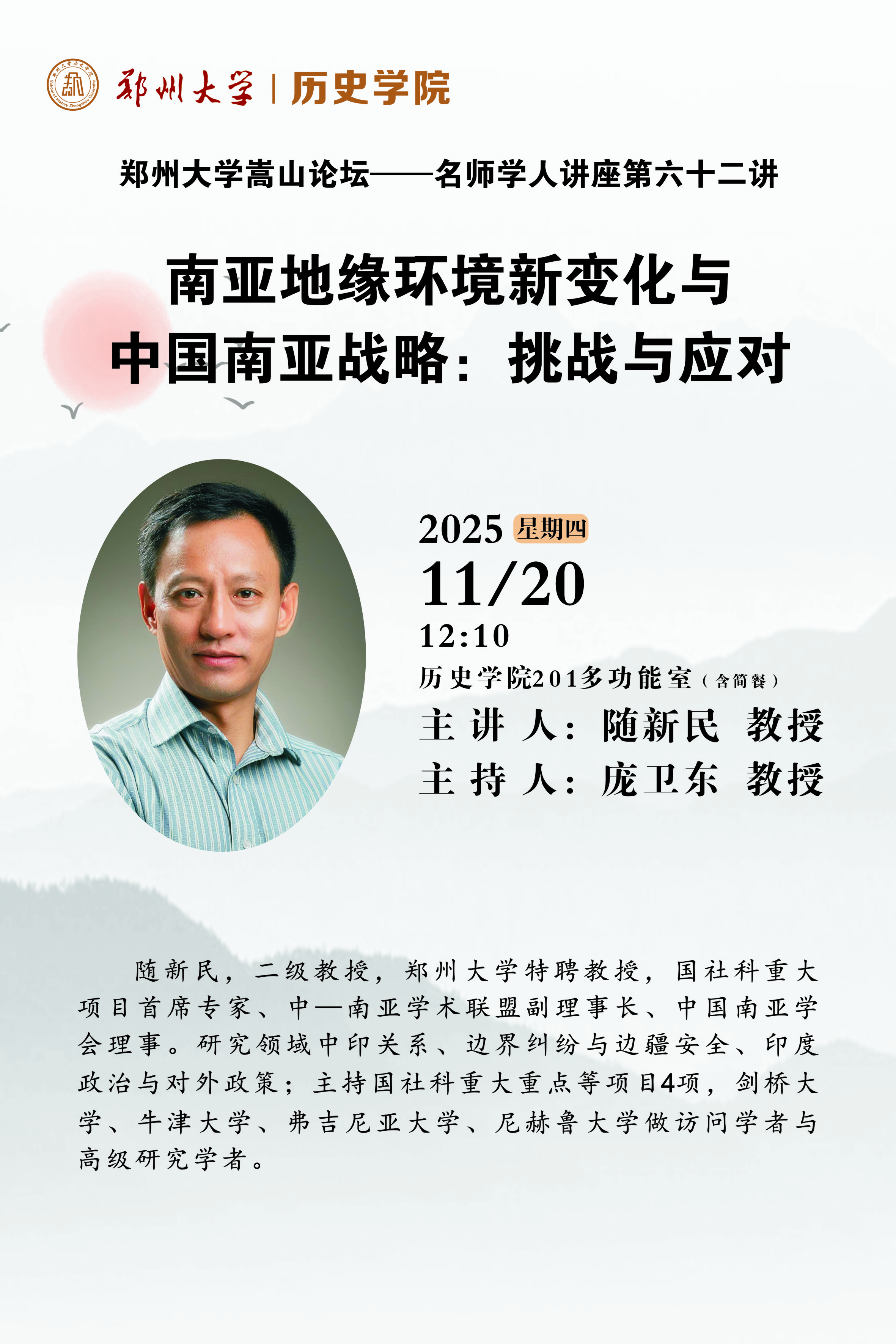 郑州大学嵩山论坛——名师学人讲座第六十二讲邀请郑州大学特聘教授随新民作题为《南亚地缘环境新变化与中国南亚战略:挑战与应对》的学术讲座,欢迎全校师生积极参加!