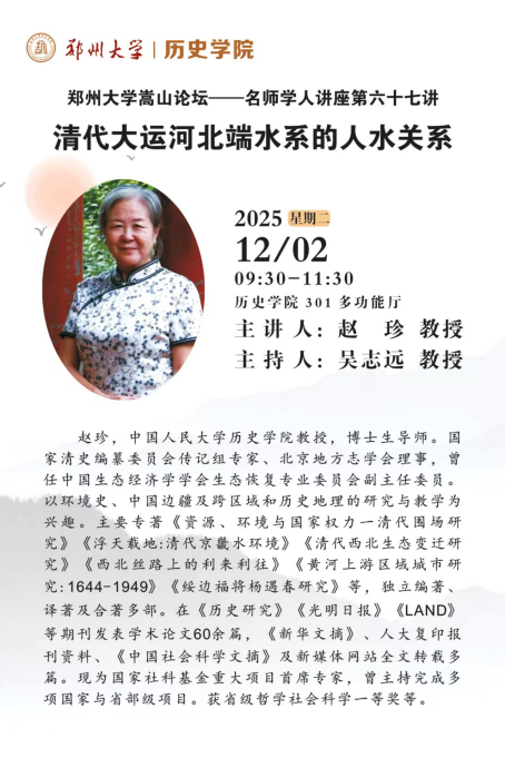 郑州大学嵩山论坛——名师学人讲座第六十七讲邀请中国人民大学教授赵珍作学术讲座,欢迎广大师生踊跃参加!