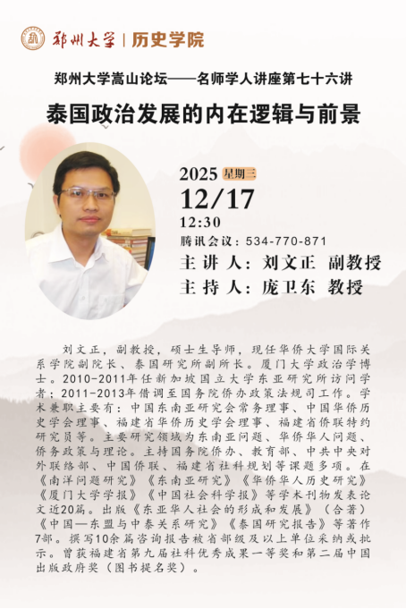 主讲人简介:刘文正,副教授,硕士生导师,现任华侨大学国际关系学院副院长、泰国研究所副所长。厦门大学政治学博士。2010-2011年任新加坡国立大学东亚研究所访问学者;2011-2013年借调至国务院侨办政策法规司工作。学术兼职主要有:中国东南亚研究会常务理事、中国华侨历史学会理事、福建省华侨历史学会理事、福建省侨联特约研究员等。主要研究领域为东南亚问题、华侨华人问题、侨务政策与理论。主持国务院侨办、教育部、中共中央对外联络部、中国侨联、福建省社科规划等课题多项。在《南洋问题研究》《东南亚研究》《华侨华人历史研究》《厦门大学学报》《中国社会科学报》等学术刊物发表论文近20篇。出版《东亚华人社会的形成和发展》(合著)《中国—东盟与中泰关系研究》《泰国研究报告》等著作7部。撰写10余篇咨询报告被省部级及以上单位采纳或批示。曾获福建省第九届社科优秀成果一等奖和第二届中国出版政府奖(图书提名奖)。