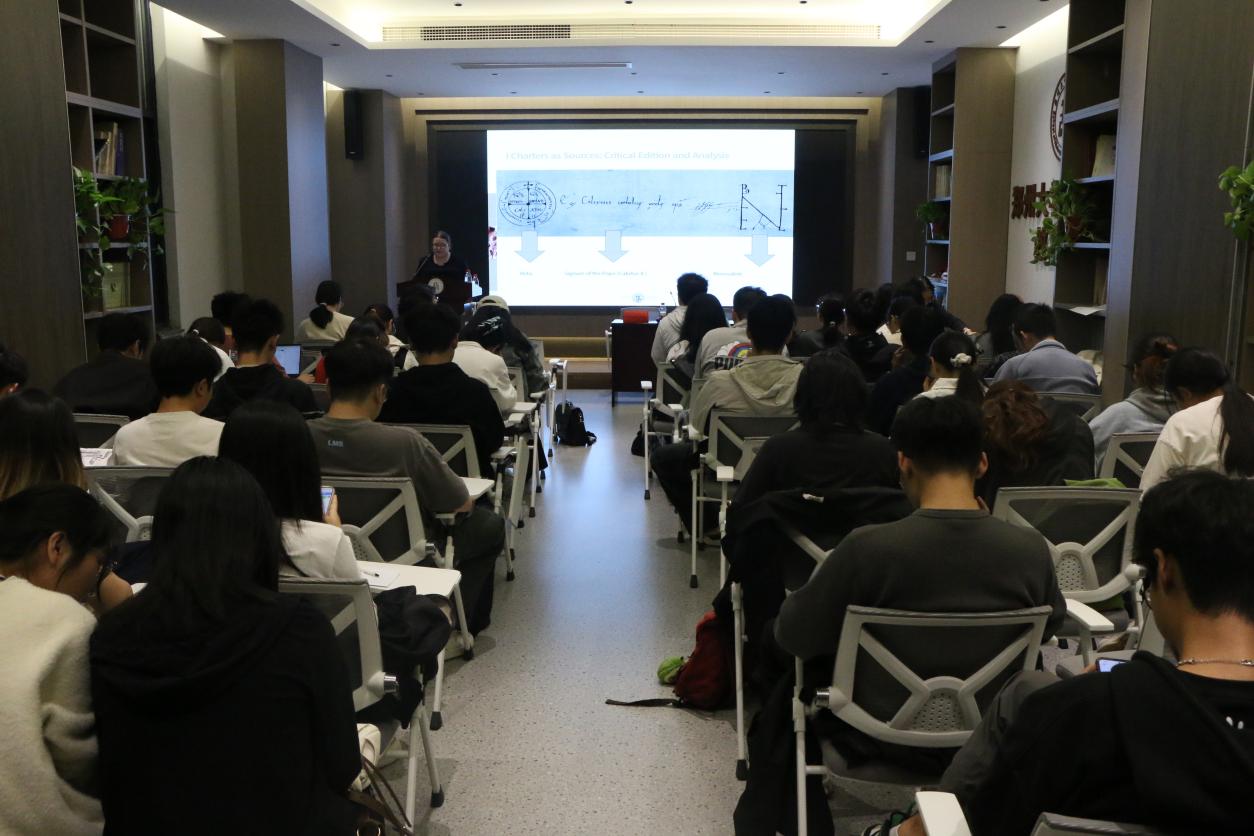 讲座伊始,夸斯博士以一份公元825年来自瑞士的私人文书为例,生动揭示了中世纪文书在修道院档案中得以大量保存的历史背景。她指出,传统文书学将中世纪欧洲文书划分为国王文书、教宗文书和私人文书三大类。这些文书作为“实用文体”,直接记录了具体法律行为,为研究者提供了理解中世纪社会运作的一手材料。接着,夸斯博士重点介绍了数字人文方法为文书研究带来的革命性变化。她以自己参与建设的数据库为例,详细展示了如何通过编码技术将大量文书文本转化为机器可读格式,从而实现跨文本、跨地域的高效比对与分析。她强调,数字基础设施使学者能够突破传统印刷版本的局限,不仅能够分析文书内容,还能系统考察其外部特征、流传路径和组合模式。在案例分析部分,夸斯博士通过对数百份早期中世纪私人文书的量化分析,挑战了学界长期以来认为中世纪文书书写高度标准化、依赖固定范本的成见。她还进一步指出,同时期的文书范本集可能也并非创作手册,其功能更接近于展示文书多样性的参考书,这反映出中世纪文书实践本质上是一种充满灵活性的书写文化。