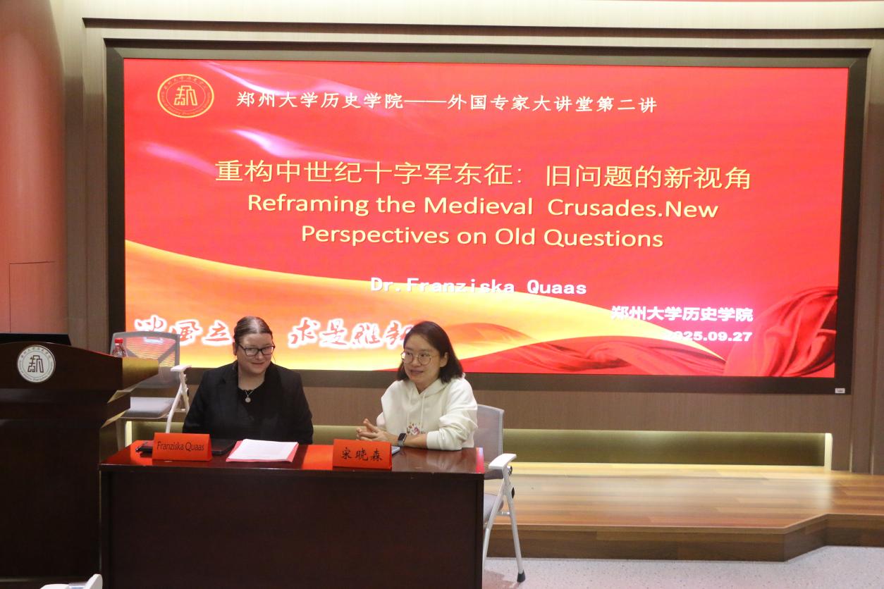 9月27日上午9点,应历史学院邀请,德国历史学者弗兰西斯卡·夸斯(Franziska Quaas)博士在历史学院204多功能报告厅为师生带来了一场题为《重构十字军东征:旧问题的新视角》(Reframing the Medieval Crusades:New Perspectives on Old Questions)的精彩讲座。夸斯博士是德国汉堡大学中世纪与近代史博士,马尔堡大学副研究员,研究方向为古文书学、军事史与战争史等。其学术生涯紧密围绕历史文献整理与数字化项目展开,曾参与汉堡大学“范本—书信—文书:中世纪早期范本集新校勘”、“暴力时代:暴力行为的时间性”等研究项目。本次讲座由世界史研究中心宋晓森老师主持,张楠老师进行翻译,50余名师生参加。