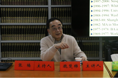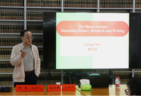 12月11日下午,应我院邀请,澳门大学历史系荣休教授、郑州大学特聘教授、欧美博睿出版社东西方交流丛书主编魏楚雄教授在历史学院201资料室作题为《影响史学研究和写作的宏观因素》的专题讲座。魏教授的研究领域为东方文化与外交、中美关系史、民族主义、中国传统文化等。曾获诸多国内外学术奖,中文著作共20余部,中英文论文共80余部。本次讲座由历史学院世界史张楠老师主持,本科生研究生20余名参加讲座。