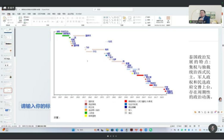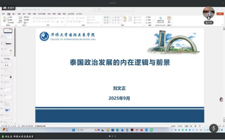 讲座伊始,刘文正教授以生动形象的方式引入了泰国这个充满矛盾与魅力的国度。他指出,在大多数中国人眼中,泰国往往呈现出现代与传统并存、开放与保守交织、微笑与冲突同在、民主与集权共生的复杂面貌。这种矛盾的印象恰恰反映了泰国政治文化的多元性和复杂性,为深入理解泰国政治发展提供了切入点。刘教授系统梳理了泰国政治发展的历史脉络,将其划分为君主专制时期、君主立宪初期和军人崛起阶段、军人威权与国王权威重建时期、民主化尝试与政治动荡阶段,以及民主化黄金时期与金钱政治盛行等多个历史阶段。通过对这一历史进程的梳理,展现了泰国政治发展的曲折性与独特性。在分析泰国政治结构时,刘教授重点介绍了该国的主要政治行为体,包括政党、军队、国王、高级司法官僚、佛教教派等多元力量。他指出,这些行为体之间既相互制衡又相互依存,构成了泰国政治生态的特殊格局,决定了政治发展的基本走向。基于对历史与现状的深入分析,刘教授进一步阐释了近年来泰国政治发展的内在逻辑,并对其发展前景进行了展望。他认为,由国王、军队和司法官僚组成的保守势力“铁三角”仍然对泰国政治保持强大的控制力;政党力量纷争不断,政治格局充满变数;对于泰国而言,如何在稳定与发展之间寻求平衡至关重要;西式民主制度在泰国水土不服,探索符合国情的“泰式民主”未尝不是可行之路。