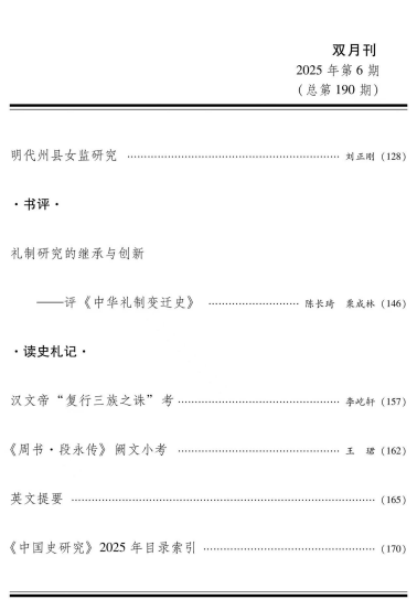 近日,我院特聘教授陈长琦、博士生栗成林在历史学权威期刊《中国史研究》2025年第6期发表了题为《礼制研究的继承与创新——评〈中华礼制变迁史〉》的学术评论文章。该文是对汤勤福教授为首席专家的国家社科基金重大项目结项成果《中华礼制变迁史》的深度评析与理论拓展,系统梳理了中华传统礼制自萌芽至近现代的变迁脉络与学术前沿。